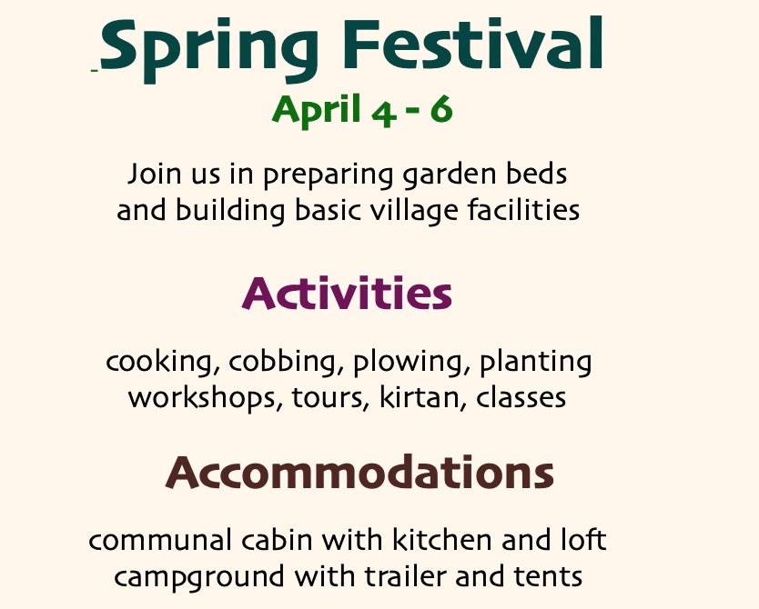 Set the tone this spring by immersing in a sattvic atmosphere and engaging in wholesome, human activities like working the land, cooking with fire, and building shelters with the abundance of nature all around us.