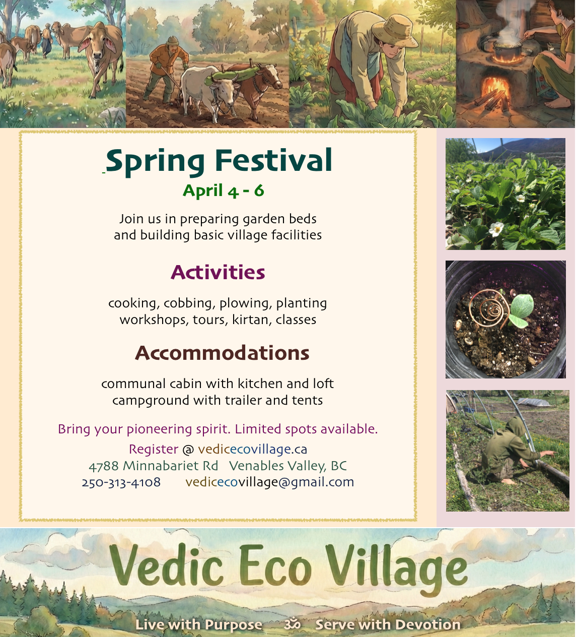 cooking, cobbing, plowing, planting; workshops, tours, kirtan, classes