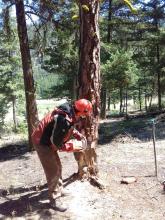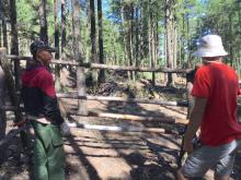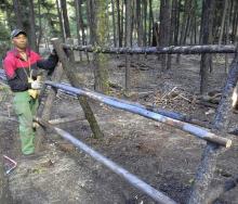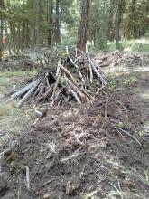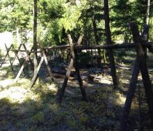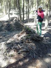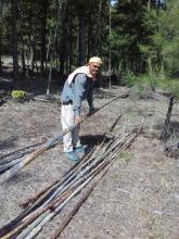 Forest management continues as we sort through the thick forest, transforming fallen and crowded thin trees into fences and other building materials. Forest floor "waste" is being raked up for use as mulch in the Eco Village Gardens