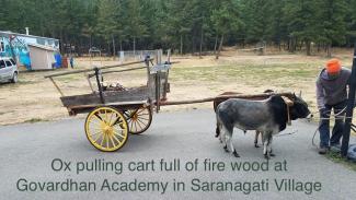 At the Govardhana Goshala, the zebu ox have been regularly put into a yoke and pulling a cart.  With the guidance of Daivata and Yoginath prabhu, they have been moving items like manure from the Goshala to gardens.  They also hauled logs for wood day at Govardhana Academy where the community cuts 12 cords of wood for the upcoming school year.