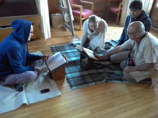 Devotees hold daily Srimad-Bhagavatam class in the morning at the cabin. Seen in the picture are Daiva prabhu giving class, and Bala Krishna prabhu’s guests visiting from the USA, Ananda mataji, wife of Dr. Gopinatha prabhu along with Rameshji from India. Not in the picture but attending class are Kisora prabhu and Danavir prabhu.