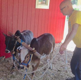 Daivata prabhu has re-launched the ox training program at Govardhan Goshala. The ox are being trained on yoke pulling a cart. When they are ready, they will pull the cart to the Eco Village and we will stay for a month in the fenced garden.  There we will train them to pull a simple hoe to turn-over the soil in preparation for planting in May.